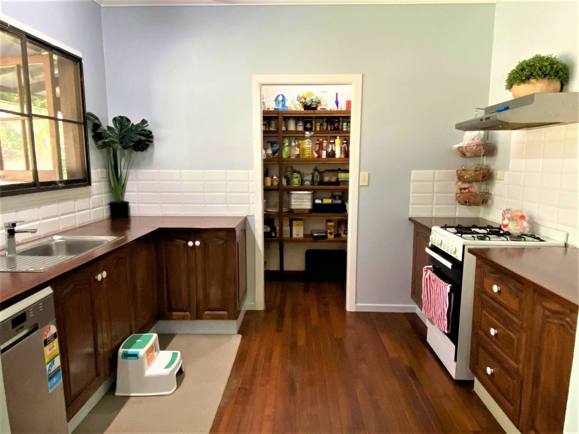 Kitchen includes a gas stove with a range hood, hand-crafted timber cupboards and benchtops and an expansive walk-in pantry. The home includes 3 spacious bedrooms, all include french doors opening onto the veranda and split system aircon.